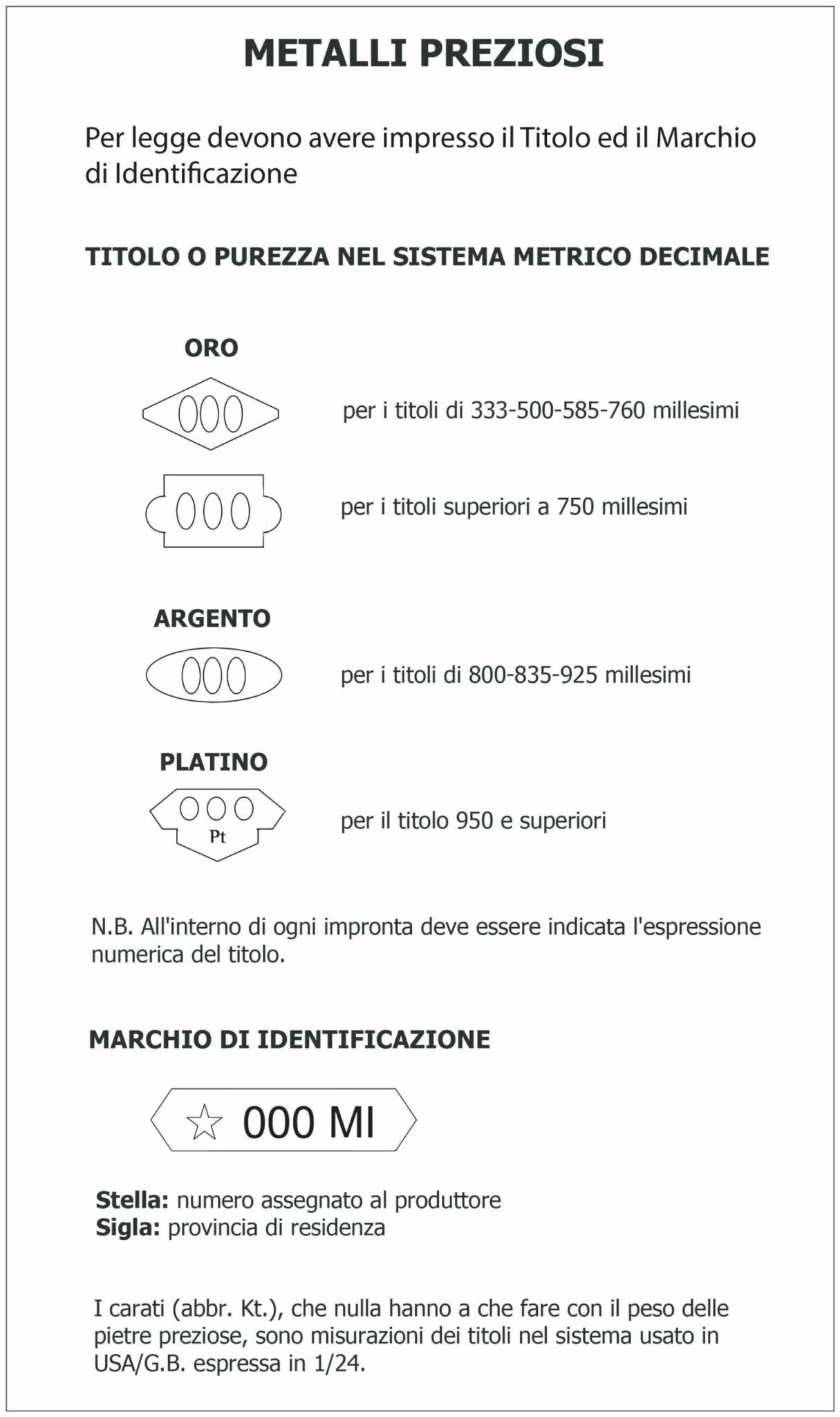 Su ogni oggetto venduto sono previsti un marchio di identificazione che contiene il numero assegnato ad ogni produttore di oggetti preziosi e la provincia in cui risiede, più il marchio del titolo (percentuale di metallo prezioso dell’oggetto) incluso in una sagoma la cui sagoma indica il metallo prezioso.