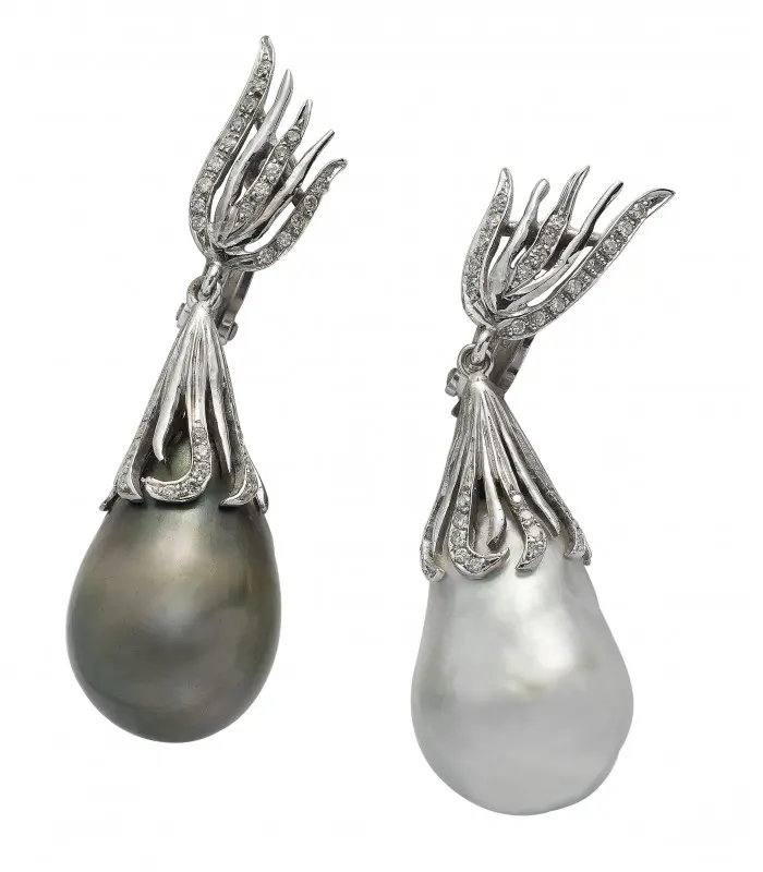 Orecchini con perle barocche, diamanti taglio brillante, oro bianco 750/000