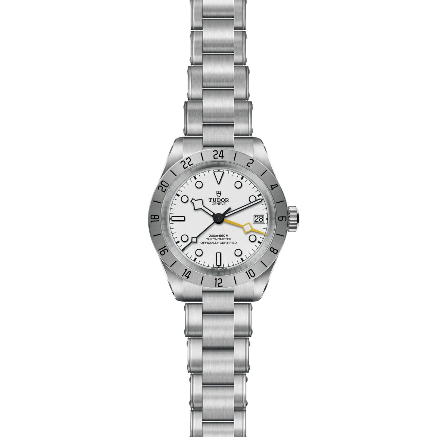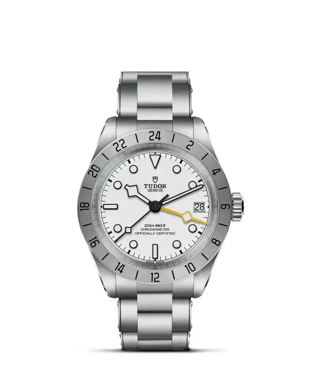 Il Black Bay Pro è dotato di doppio fuso orario, una complicazione tecnica che permette di visualizzare l’ora locale senza perdere di vista l’ora di un altro fuso orario. Compatto, robusto e sportivo, questo modello presenta numerosi dettagli estetici unici e celebra lo spirito degli orologi tecnici che TUDOR ha prodotto per i professionisti nel corso della sua storia. Riconoscibile grazie alla lunetta fissa satinata graduata 24 ore e alla lancetta “Snowflake” 24 ore di colore giallo, il Black Bay Pro è animato dal Calibro di Manifattura TUDOR MT5652 con funzione GMT integrata. Quest’anno viene introdotto un quadrante opalino all’interno della gamma.